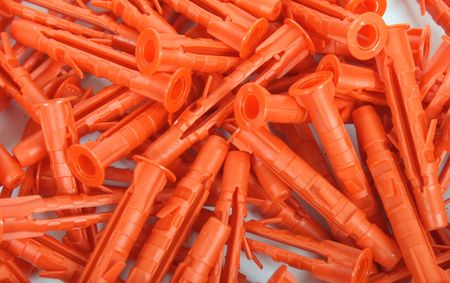 Plastic orange dowels on the white background. Construction and building background.
