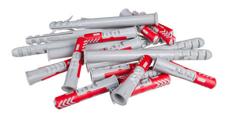 Pile of universal expansion plastic anchors isolated on a white background. Conical two-material inserts and split-ribbed wall plugs. Duo power fasteners for anchoring into various building materials.