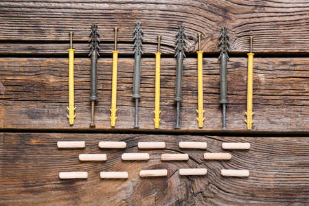 Group of Dowels and Nails on wooden background. Dowels for fastening in concrete. Flat lay top view with a copyspace for text. Stock photo