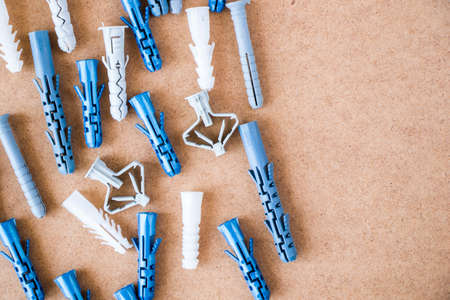 Large group of different plastic wall plugs on the brown background, high angle view