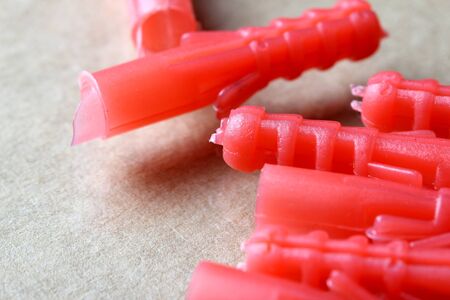 Dowels wall plugs close up. Plastic blue dowels on red background, dowels for fixation and installation and various wall materials, concrete and wood. Accessories for repairing and handymen