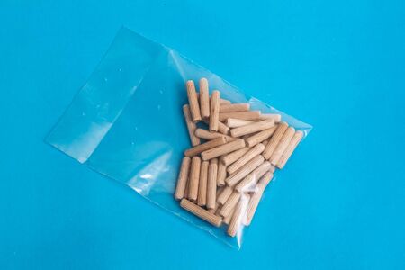 Wooden dowels in a package on a blue background