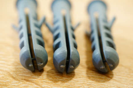 Plastic wall plugs on wooden background.