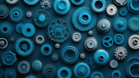 An abstract arrangement of blue gears and cogs creates a captivating texture suited for industrial themes. Perfect for technology and engineering backgrounds.