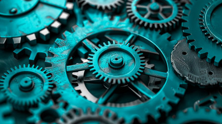 A visually striking arrangement of black gears on a vibrant turquoise background, perfect for representing industrial concepts, innovation, and collaboration.