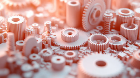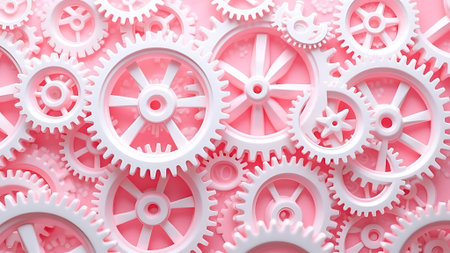 A vibrant assortment of white and pink plastic gears offers a playful and creative backdrop. Ideal for concepts in engineering, technology, and design.