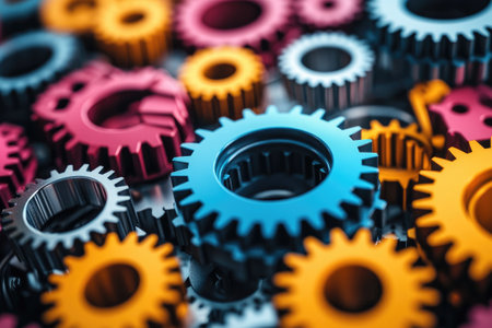 Vibrant gears of various sizes and colors interlock, symbolizing teamwork, engineering, and industrial processes