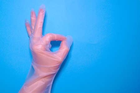 Womens hands in transparent household gloves depict the sign everything is ok. Hand protection.