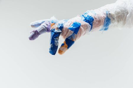 Big plastic hand made of garbage isolated on white studio
