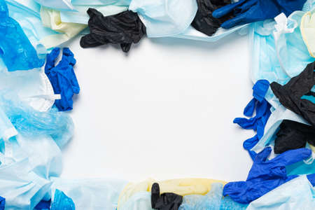 Waste of used personal protective equipment PPE gloves, disposable masks, shoe covers of medical workers in the form of a background. Garbage contamination after the COVID-19 pandemic.