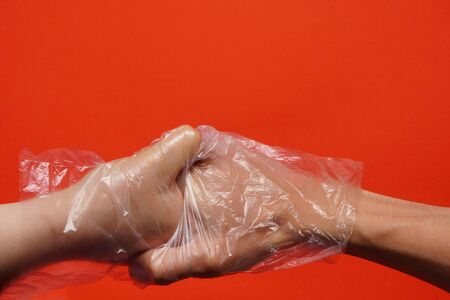 Handshake of man and woman on red background, hands in disposable transparent plastic or rubber gloves. Communication after coronavirus pandemic, distancing, protecting hand from viruses and bacteria