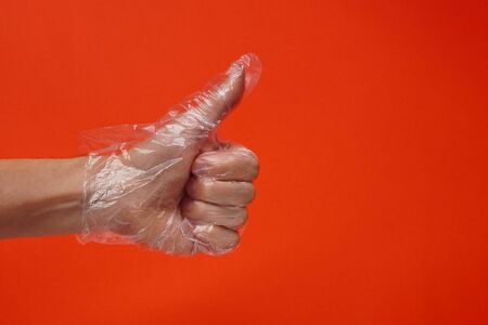 One hand in plastic or rubber protective disposable gloves on red background. Protection against viruses and bacteria during coronavirus pandemic.Thumbs up sign, copy space, ok or like sign concept.