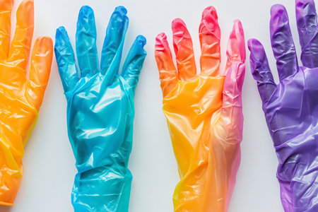 Four colorful medical gloves are lying on a white surface, creating a cheerful and vibrant atmosphere