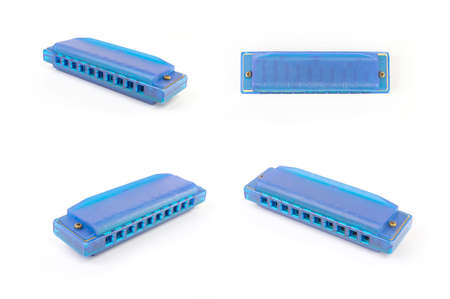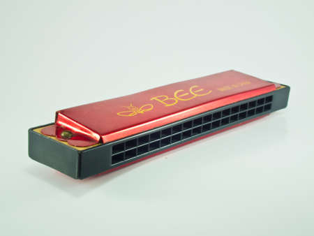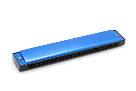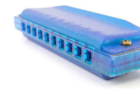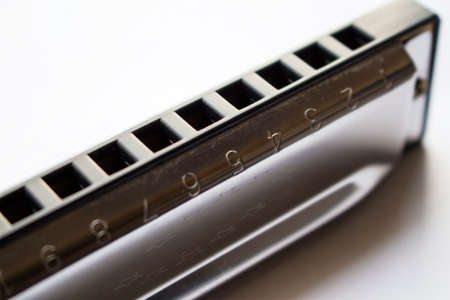 A closeup of a harmonica isolated in a white background.