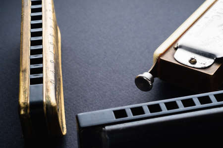 the old two diatonic and one chromatic harmonica, one on top of the other on a dark background. Horizontal orientation. copy space from left