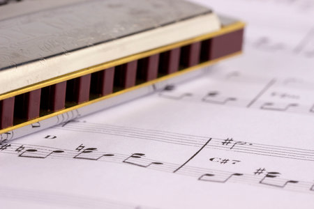A harmonica on music sheets background