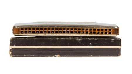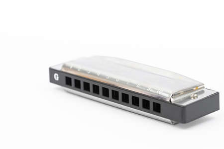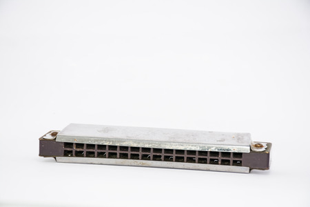 Vintage harmonica on a white background. Musical instrument close-up.