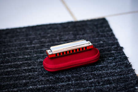 red blues harmonica on top of its case