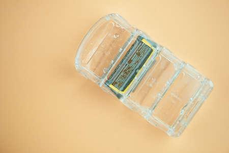 Used grungy rusty shaving refill blade in box. Top view