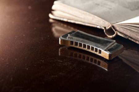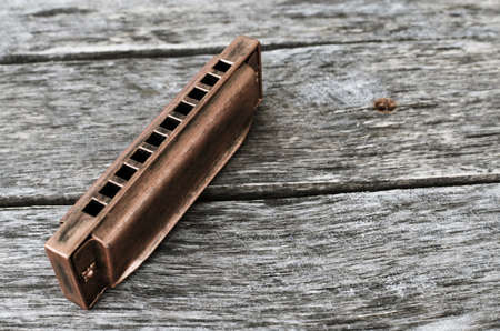 vintage wooden harmonica lying on wooden desk.