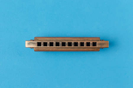 Old harmonica on a blue background.