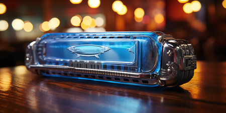 A striking vintage police light bar featuring vibrant red and blue lights, casting a captivating glow on a dark surface, ideal for creative projects or thematic displays.