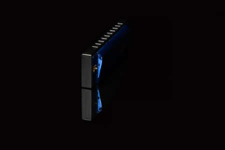 The harmonica lies on a mirrored surface. Classical musical wind instrument.