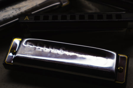A close-up of the harmonica, highlighting its brilliant details and texture, ready to create the melodies and atmosphere of the music.