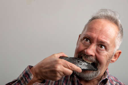 crazy Middle age gray-haired man eats his smartphone in anger