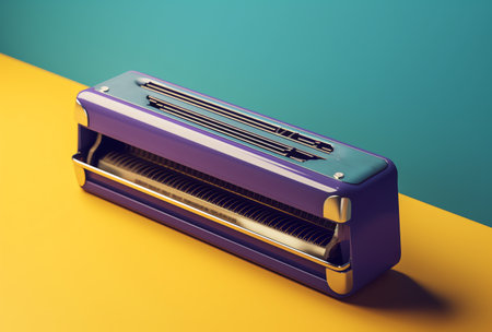 3d render of a vintage stapler on yellow and blue background