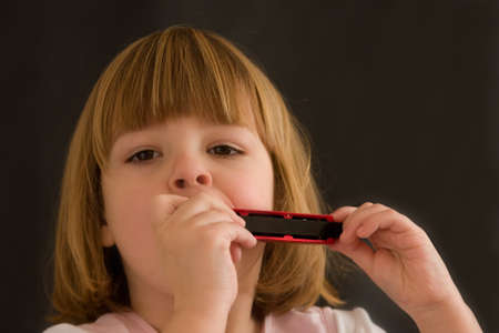 boy with long blond hair playing harmonica