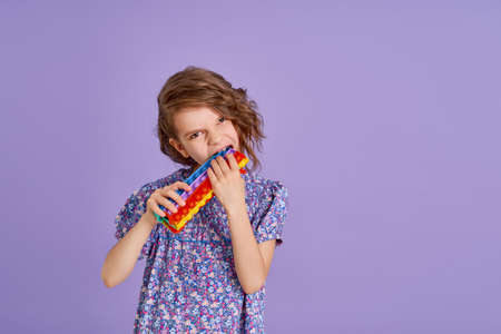 Teen age Girl in blue summer flower print dress holding antistress toy on lavender background, isolate.
