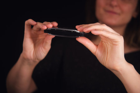 Woman preparing to play the harmonica, a small musical instrument, for a musical performance or hobby practice.