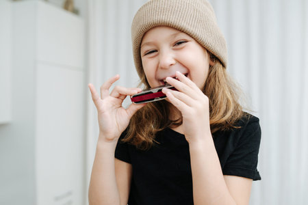 Cheeky little girl in a beige hat playing with a harmonica, smiling. At home in front of a white curtains.