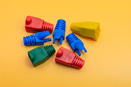 caps on a wire rj45 assorted bright blue, green on a wooden background