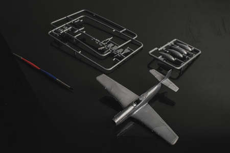 Detail of assembly of plastic model aeroplane resin kit with glue. Cement glue used to glue parts of plastic model aeroplane together.