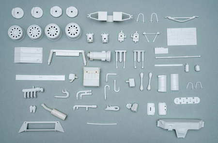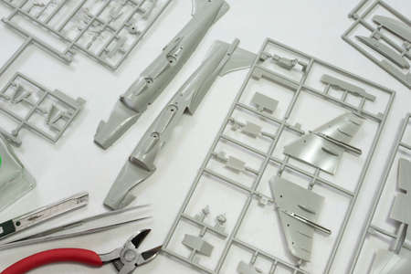 Detail of parts of plastic model aeroplane resin kit. Parts of plastic model aeroplane in a frame waiting to be assembled.