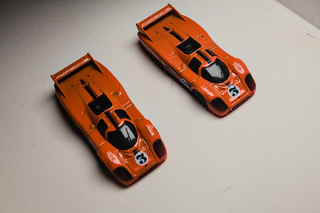 Mantua, Italy - 28TH DECEMBER 2025 - Hot Wheels replicas of two Porsche 917C in orange race livery pretending to have a race on a race track