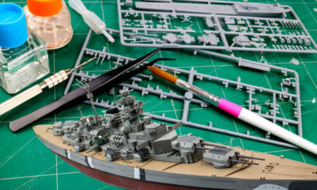 top view of Assemble WW2 warship plastic model with equipment set and tools for hobbyists , scale model of a ship, Hobby and leisure at home in quarantine.