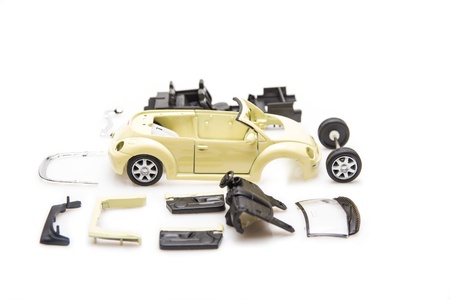 Close-up wheels and different parts of handcrafted miniature auto toy.