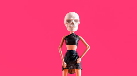 Plastic doll with skull for head dressed in black leather top and skirt on pink background. wide banner.