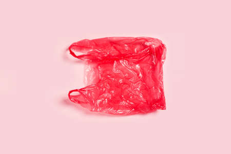 Zero waste concept. Plastic red bag on pink background.