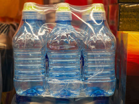 A package of mineral water with a sports cap. Wrapped in plastic wrap.