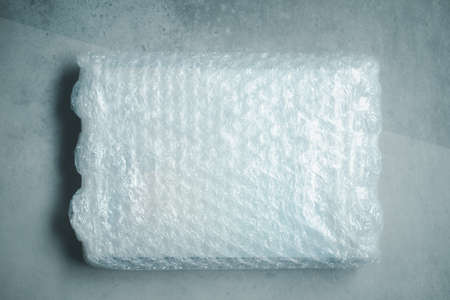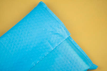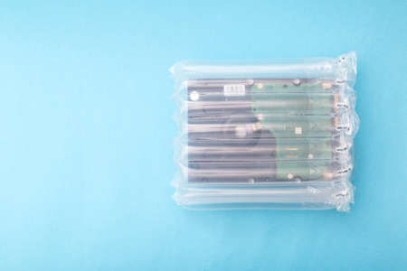 Protective air plastic packaging for transporting a parcel without damage on a blue background. The concept of modern safe packaging, copy space for text, manufacturing