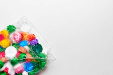 Colorful plastic bags on white background. Copy space