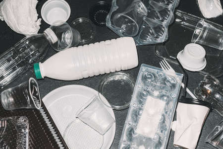 Top view of crossed plastic cutlery surrounded by plastic garbage.