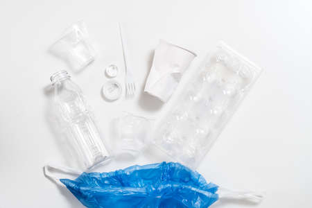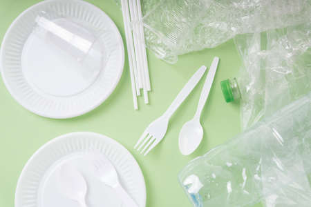 Waste plastic disposable bowls and spoons on a light background. The concept of waste minimization, plastic recycling industry and consumerism. Background with place for text, Top view. Part of a series