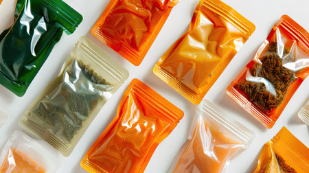 Assorted cat food pouches laid out on a white surface, close-up