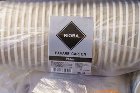 Disposable cups. Background with copy space for text. Illustrative editorial. December 18, 2021 Balti Moldova.