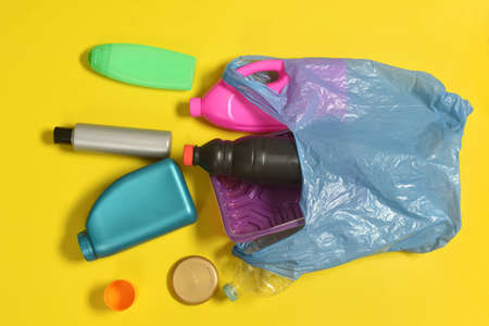 open garbage bag with plastic bottles scattered on yellow background